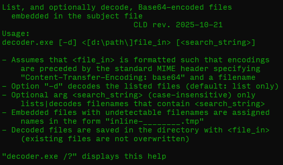 - decoder.exe List, and optionally decode, Base64-encoded files embedded in the subject file. Assumes that encodings are preceded by the standard MIME header